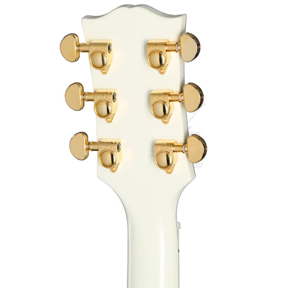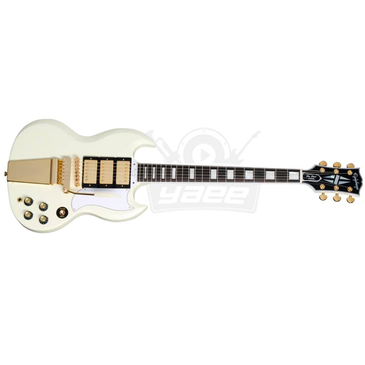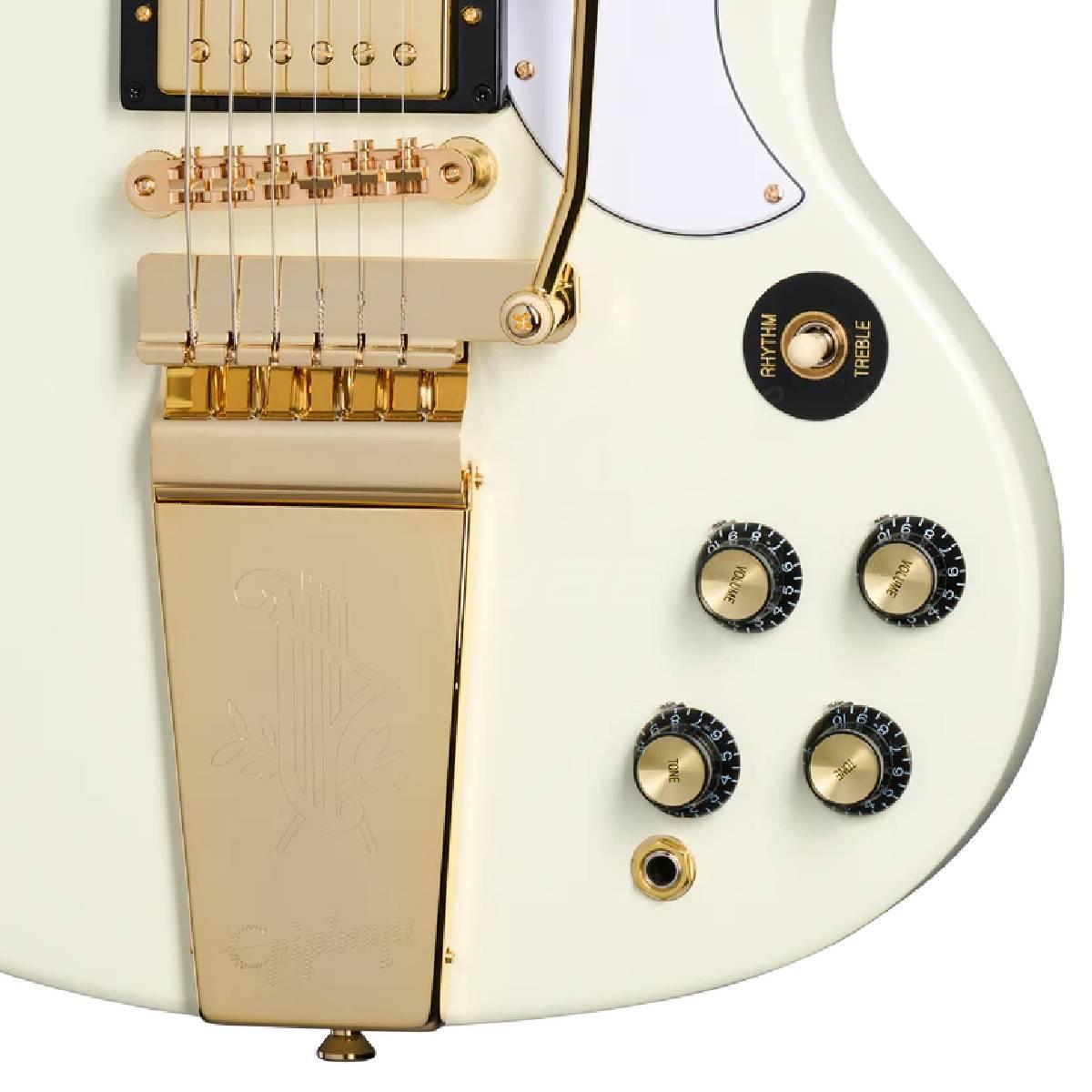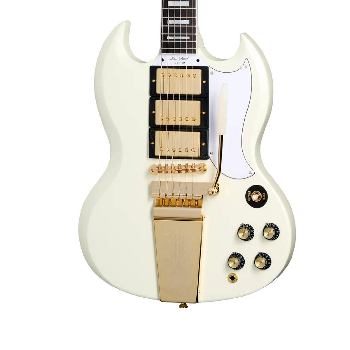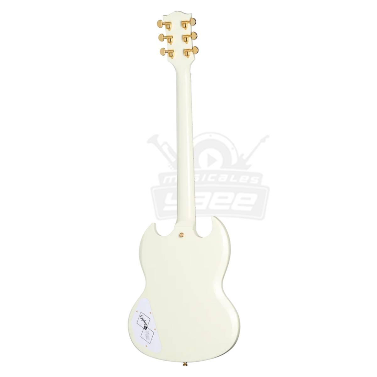 Fabricada en colaboración con Gibson™ Custom, la Epiphone 1963 Les Paul SG con vibrola Maestro es una impresionante recreación del clásico modelo vintage. 1963 fue el último año en que se utilizó el apodo “Les Paul” en SG™ Custom y el primer año para la Vibrola™ Maestro™. Aquí están presentes todos los detalles de primera clase por los que el modelo es conocido y amado, incluido un mástil de caoba de una pieza con un tenon de mástil largo, un perfil SlimTaper™ y un diapasón de ébano unido. También cuenta con inlays de diapasón de bloque de madreperla y un inlay de diapasón de diamante dividido Custom en la pala de “libro abierto” estilo Gibson unida. Los componentes electrónicos son igual de impresionantes, con tres pastillas Humbucker USA Gibson Custombucker de EE. UU. cableadas a mano a potenciómetros CTS®, condensadores Mallory™ y una entrada de jack e interruptor de palanca de selección de pastillas Switchcraft®. El acabado VOS (Vintage Original Sheen) blanco clásico se complementa muy bien con los herrajes dorados, incluidos los afinadores Grover® Rotomatic® de relación 18:1. También se incluye una funda rígida negra con gráficos Inspired by Gibson Custom y un interior amarillo dorado.