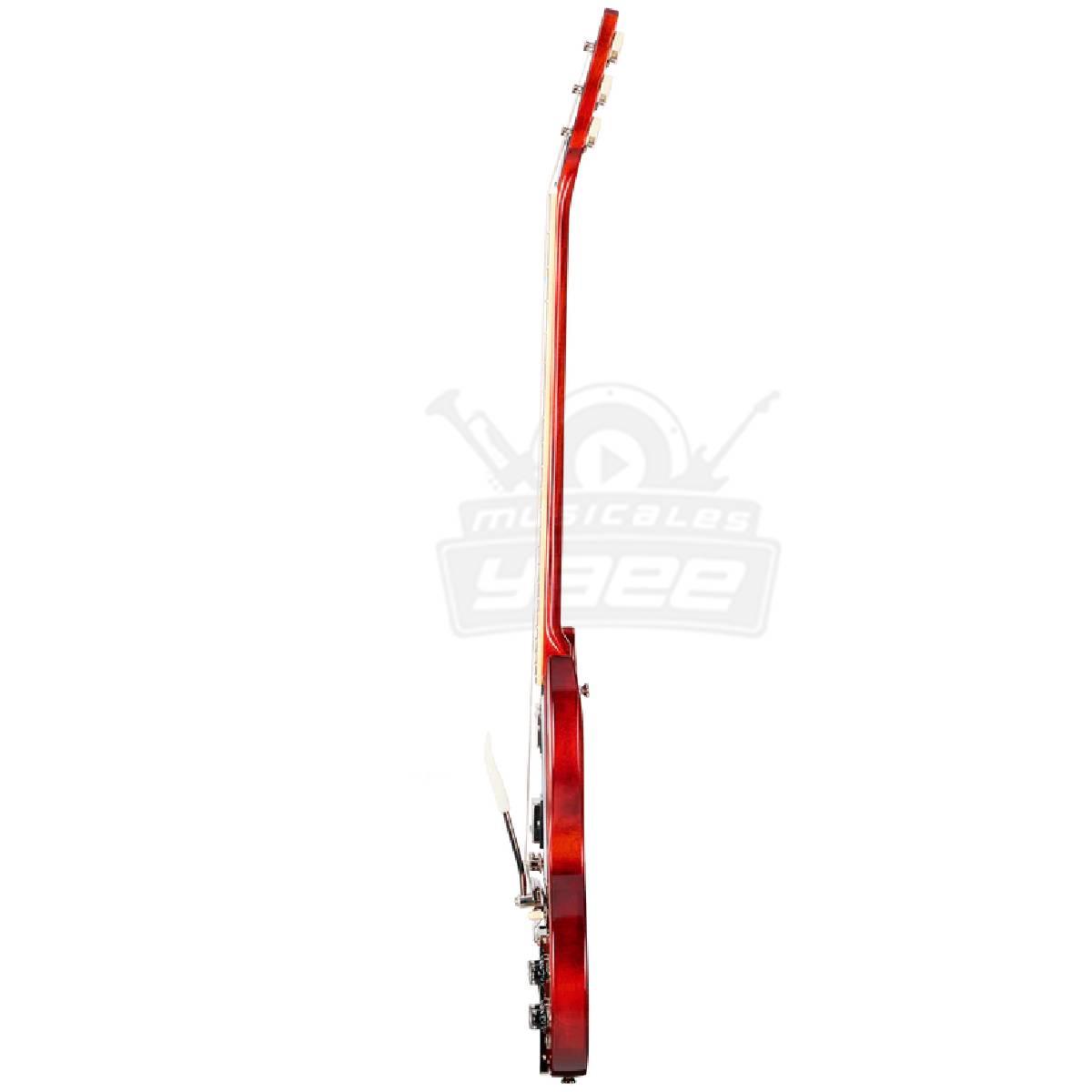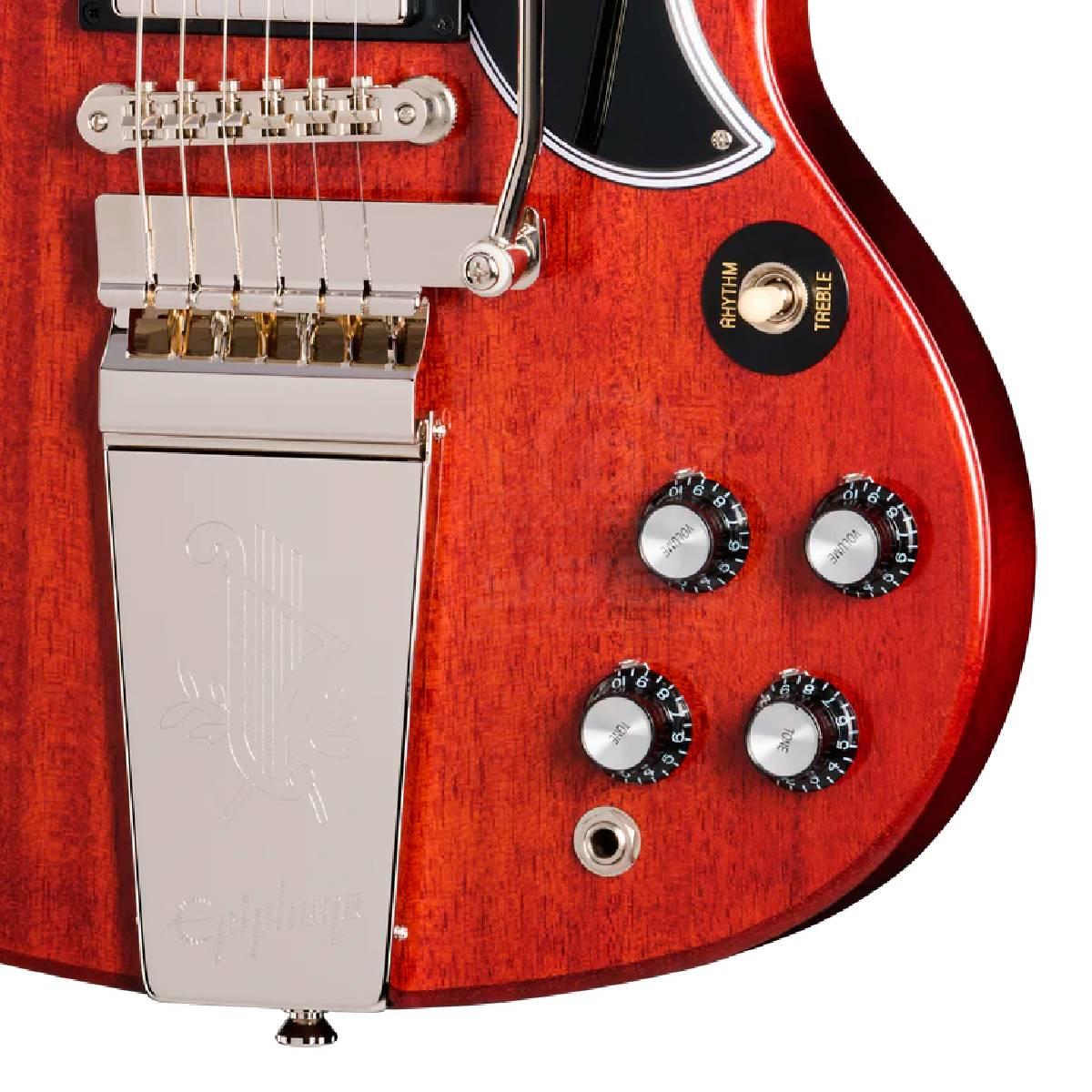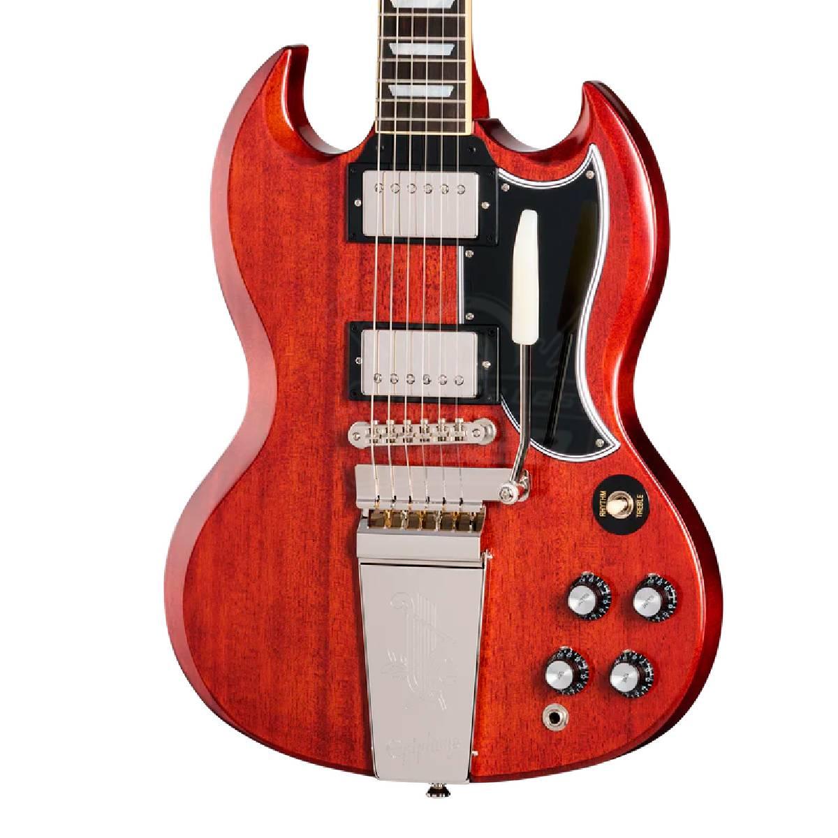 La SG™ Standard de 1964 con Maestro™ Vibrola™ recrea uno de los años más queridos de la historia de la SG: la SG Standard de 1964. Si bien la SG Standard de 1964 fue utilizada por guitarristas de la talla de George Harrison y Eric Clapton, este año destacó para la SG en general. Para 1964, el vibrato lateral, menos intuitivo, había sido reemplazado por el fiable Maestro Vibrola, mientras que el perfil del mástil aumentó ligeramente de grosor con respecto a los perfiles ultrafinos de algunos modelos SG anteriores. El equilibrio, la comodidad al tocar y la estética de la SG alcanzaron su máxima expresión. 1964 también fue el primer año completo en que la SG dejó de usar el nombre Les Paul. Ahora, Epiphone se enorgullece de presentar la reedición de la SG Standard de 1964 con Maestro Vibrola, una impresionante recreación de este legendario modelo. Creada en colaboración con Gibson™ Custom, la Epiphone 1964 SG Standard con Maestro Vibrola es la recreación más auténtica de la SG Standard de 1964 jamás lanzada por Epiphone. Todas las características clásicas que hicieron famosa y apreciada a la SG Standard de 1964 están presentes, incluyendo un mástil de caoba de una sola pieza con una unión a tope larga para mayor estabilidad y sustain, un cómodo perfil SlimTaper™ de ejecución rápida y un diapasón de palisandro ribeteado. También cuenta con incrustaciones trapezoidales de nácar en el diapasón, el logotipo de Epiphone envejecido en nácar en el clavijero y una incrustación de la corona de Gibson envejecida en el clavijero estilo "libro abierto" de Gibson. El cuerpo de caoba de dos piezas con costura central presenta los biseles cómodos y distintivos que definen el estilo vintage de una SG y la hacen tan cómoda de sostener y tocar. La electrónica es igualmente impresionante, con dos pastillas humbucker USA Gibson Custombucker con imanes Alnico 3, cableadas a mano a potenciómetros CTS®, condensadores Black Beauty de papel y aceite, y un selector de pastillas Switchcraft® con jack de salida. El acabado Vintage Gloss se complementa a la perfección con los herrajes de níquel, incluyendo clavijas Epiphone Vintage Deluxe "Double Ring". Se incluye un estuche rígido negro con gráficos Inspired by Gibson Custom, herrajes dorados e interior color amarillo dorado.