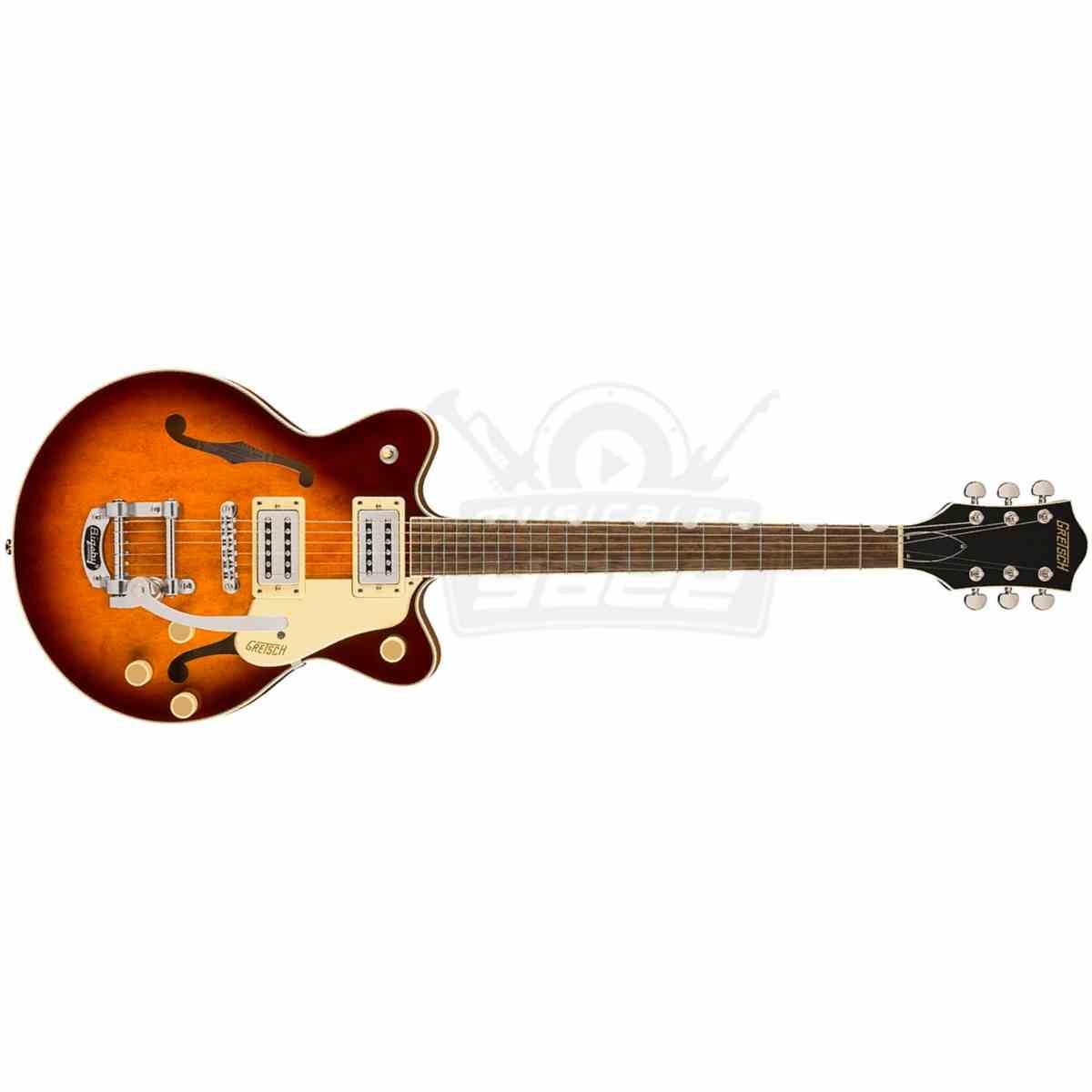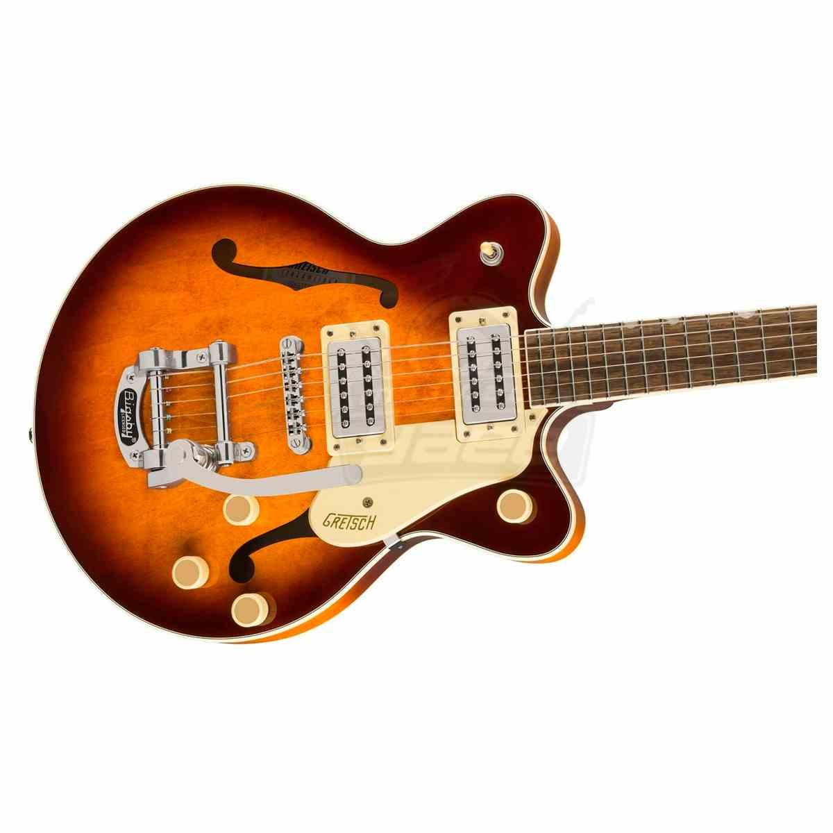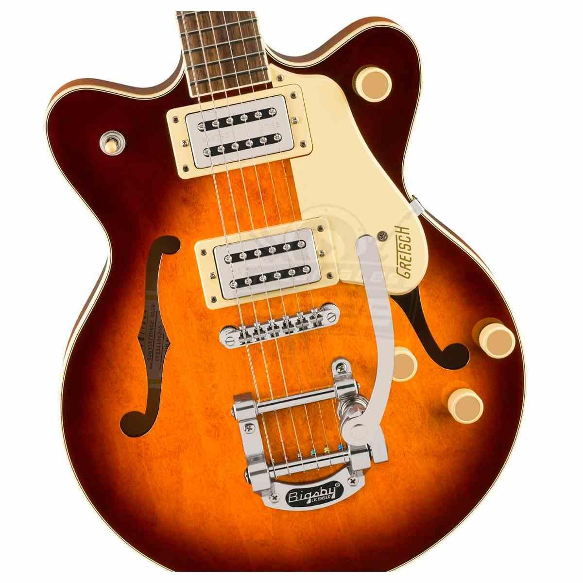 La Gretsch G2655T Streamliner CB Jr w/ Bigsby es una guitarra elegante y versátil, ideal tanto para músicos profesionales como aspirantes. El cuerpo de arce laminado con tapa arqueada, la construcción de bloque central y el cordal Bigsby B50 no sólo realzan su encanto vintage, sino que también garantizan un sustain mejorado y una retroalimentación reducida. Está equipada con pastillas Broad'Tron BT-3S, que ofrecen una gama sonora que va desde los tonos ricos y cálidos a los potentes y articulados, con posibilidades sonoras adicionales gracias a la función de división de bobinas push/pull.