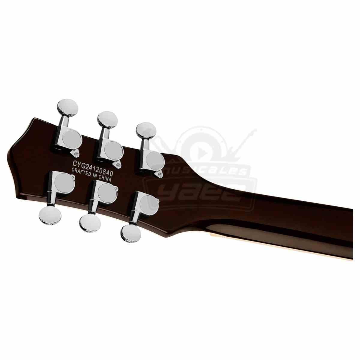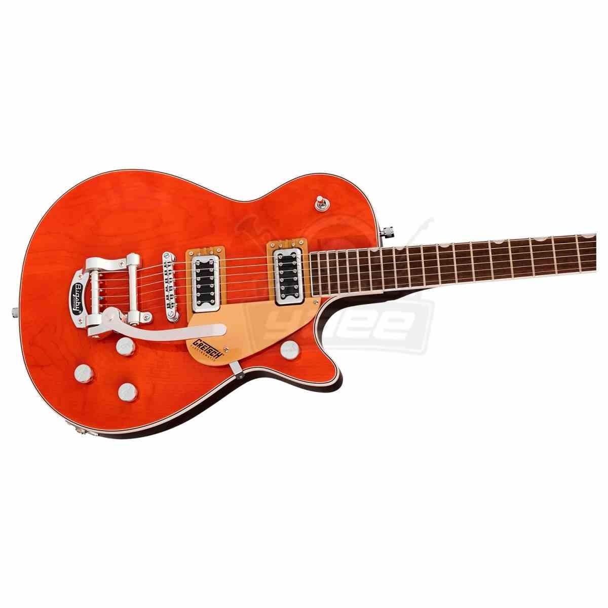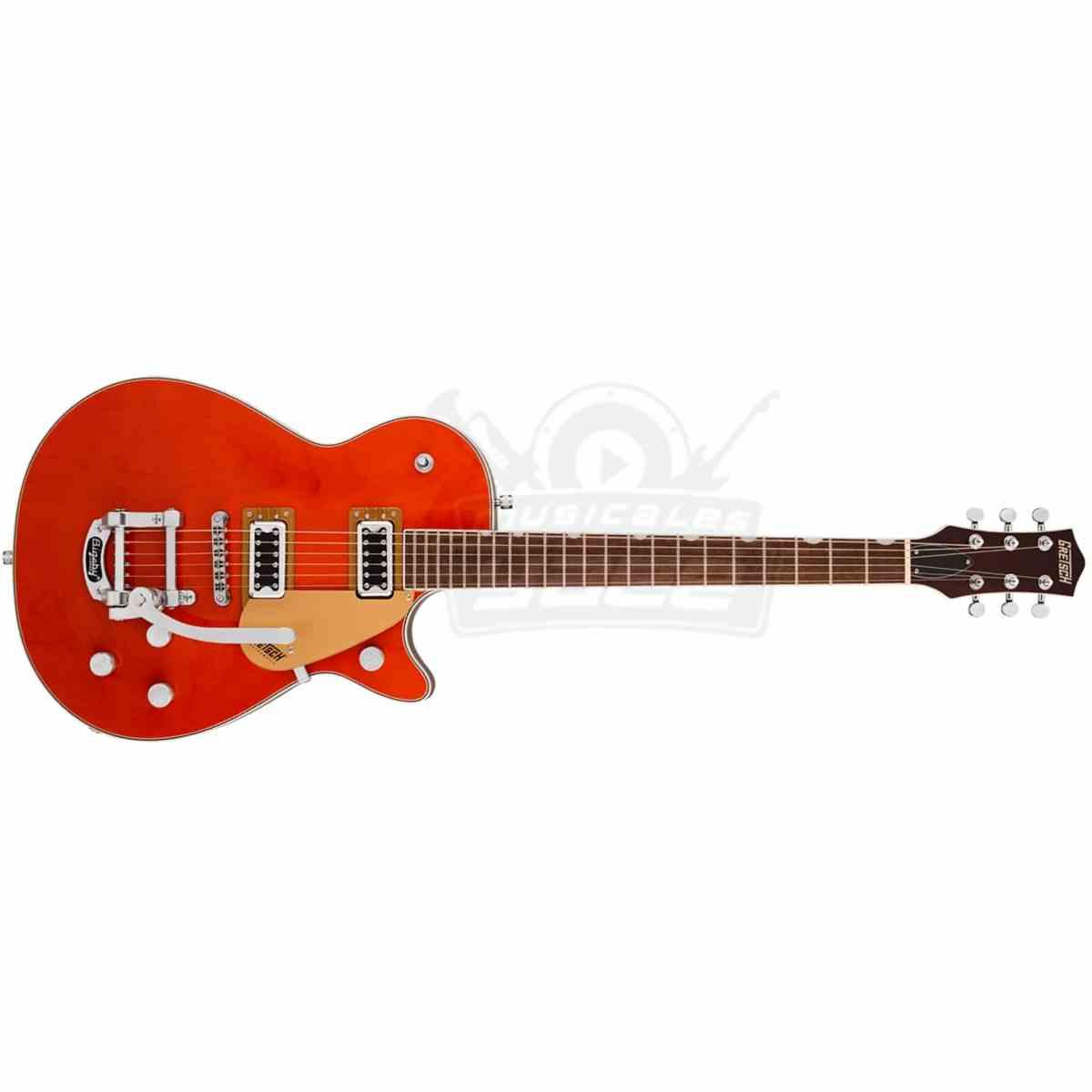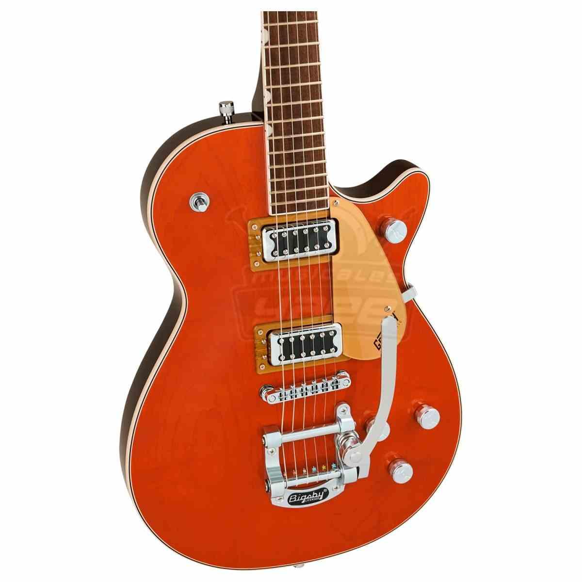 Gretsch G5230T Electromatic Jet FT Single-Cut con Bigsby es una guitarra eléctrica atrevida de inspiración retro que combina el estilo Jet clásico con un rendimiento moderno. Con un cuerpo de caoba ahuecadas y tapa de arce arqueada, ofrece un tono rico y resonante con graves ajustados, medios centrados y agudos brillantes, todo ello envuelto en un impresionante acabado Orange Stain.Equipada con pastillas dobles Black Top Filter'Tron, un trémolo B50 Bigsby y un circuito de purga de agudos, ofrece un tono articulado y un control expresivo a cualquier volumen. Los detalles de Vintage, como el golpeador de plexiglás gold, los mandos G-Arrow y las incrustaciones en forma de uña, completan el look con la inconfundible actitud de Gretsch