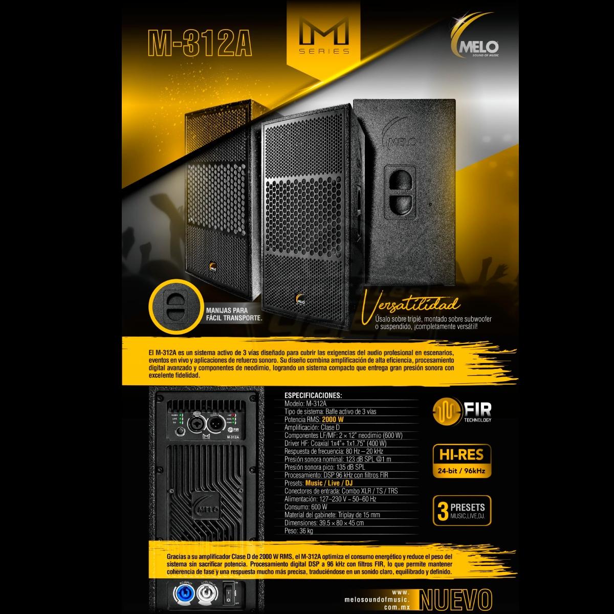 PRESENTAMOS al nuevo integrante de la SERIE M; el M-312A es un sistema activo de 3 vías con 2000 W RMS, diseñado para aplicaciones profesionales de audio en vivo.